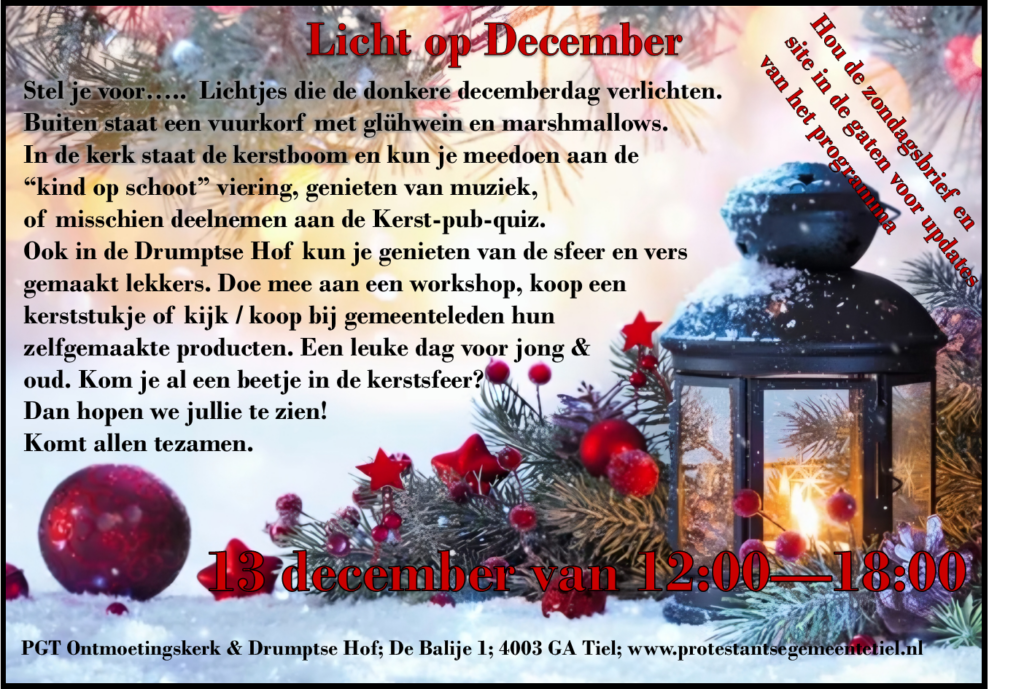 « Alle Evenementen Licht op december 13 december 2025 @ 12:00 – 18:00 Ontmoetingskerk, de balije 1, Tiel de balije 1 Tiel, gelderland 4003 GA Nederland + Google Maps Toevoegen aan kalender Google Calendar iCalendar Outlook 365 Outlook Live